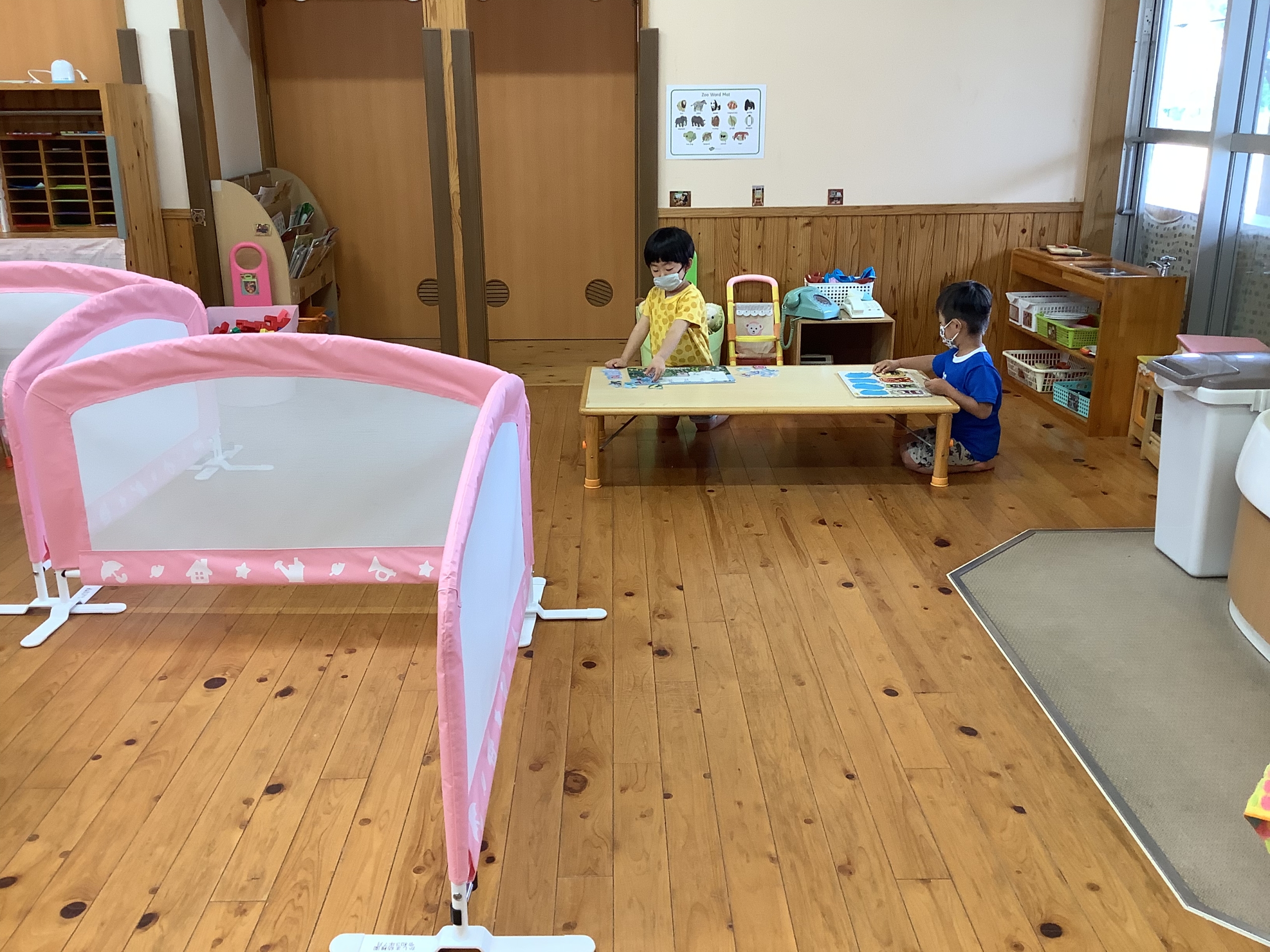 食べ終わったお友達から、片付けをして仕切られた食後ゾーンで、絵本を見たりパズルをしたり、静かに遊んでいます。