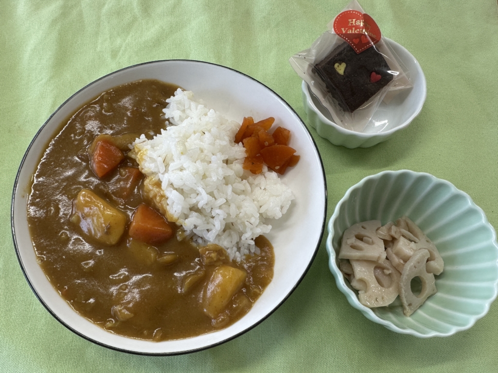 2026/02/13 今日の給食 2月13日の給食です。 今日の献立です。 ・カレーライス ・焼きレンコン ・福神漬け ・ブラウニー(シェフ・パティシエ科デザート) 今日のおやつは「南瓜ケーキ」でした。 前のページ