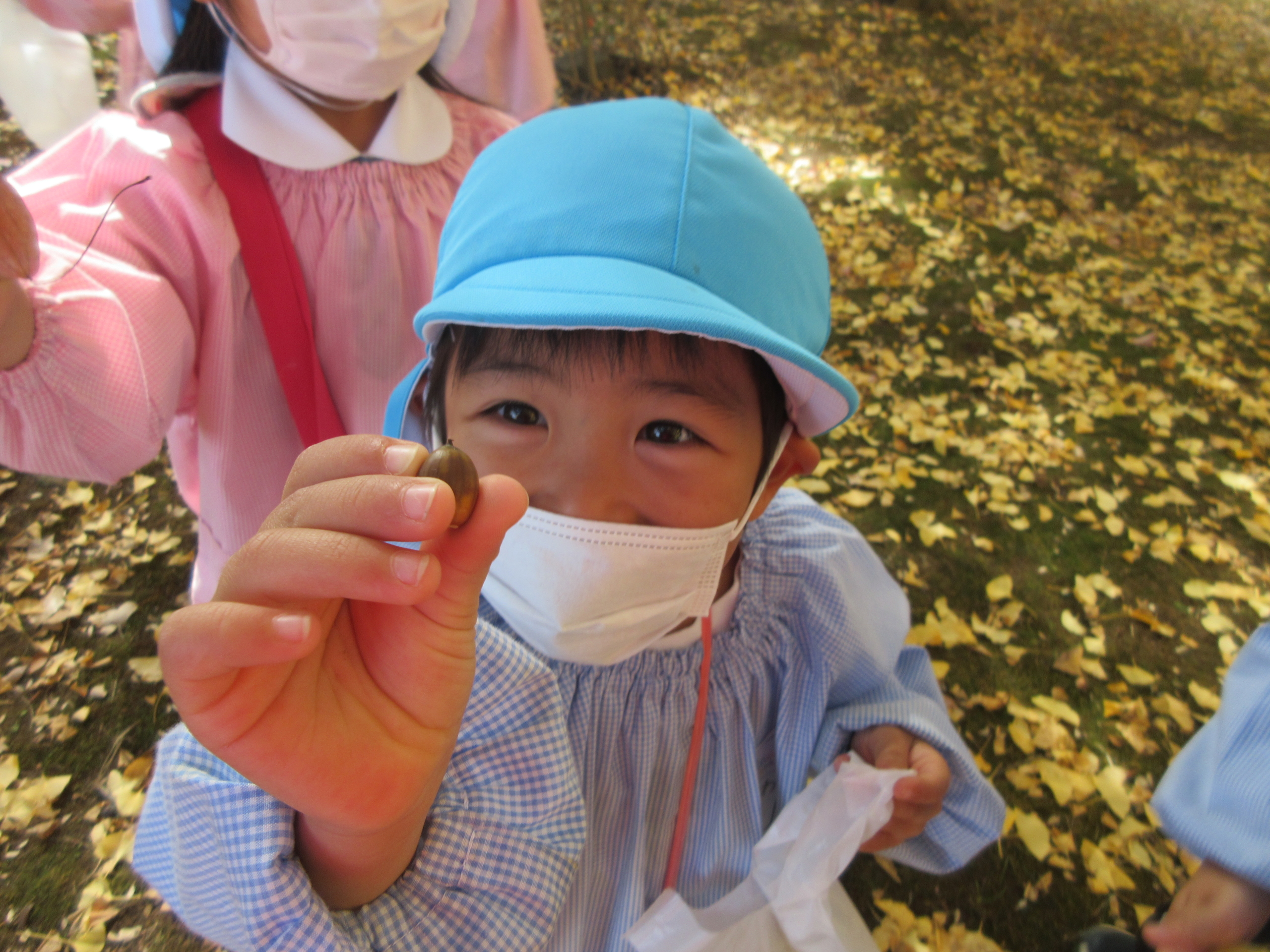 イチョウの葉っぱには様々は形があることをご存知ですか😊イチョウは、雄雌異株、つまり、「オス」「メス」があります。ズボンのように割れているのがオス、スカートのようにつながっているのがメスという説がありますが、それは俗説で、実際は葉っぱの形では全く見分けられないそうです😌💦でも、子どもたちは、「ズボンの形、どこかな??」「男の子の木なのかな?」と葉の形にもこだわって、楽しんでイチョウ探索をしていましたよ🎶