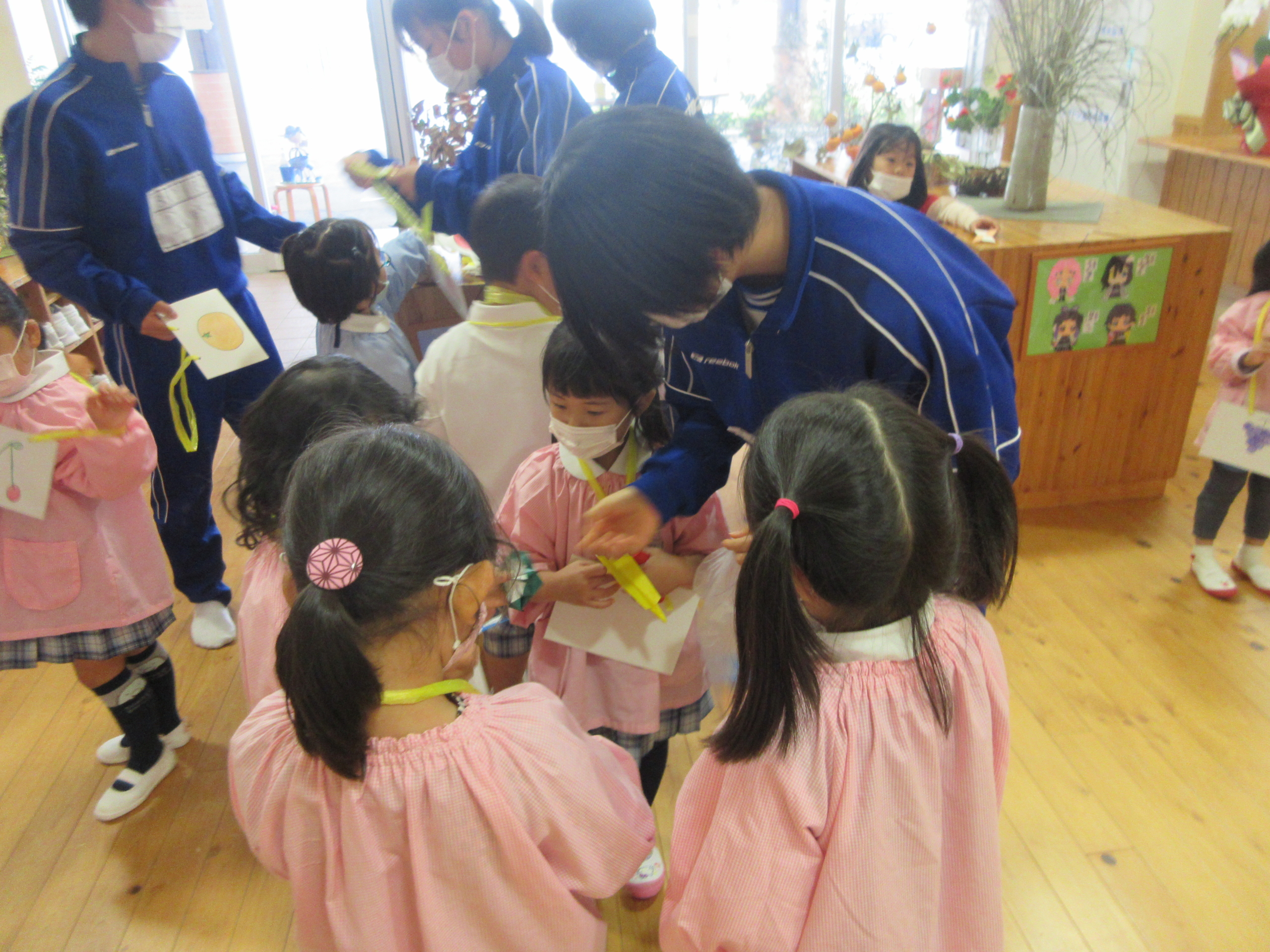 今日は、お隣の嘉島中学校3年生のお兄さん・お姉さんが、家庭科の保育実習ということでやってきました😊