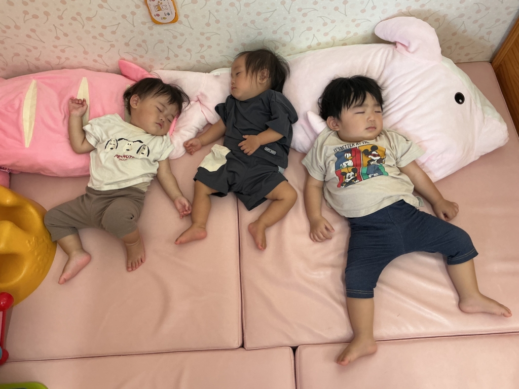 給食を終えるとすぐに眠くなり…写真は3人一斉に眠ってしまった可愛い姿です❤