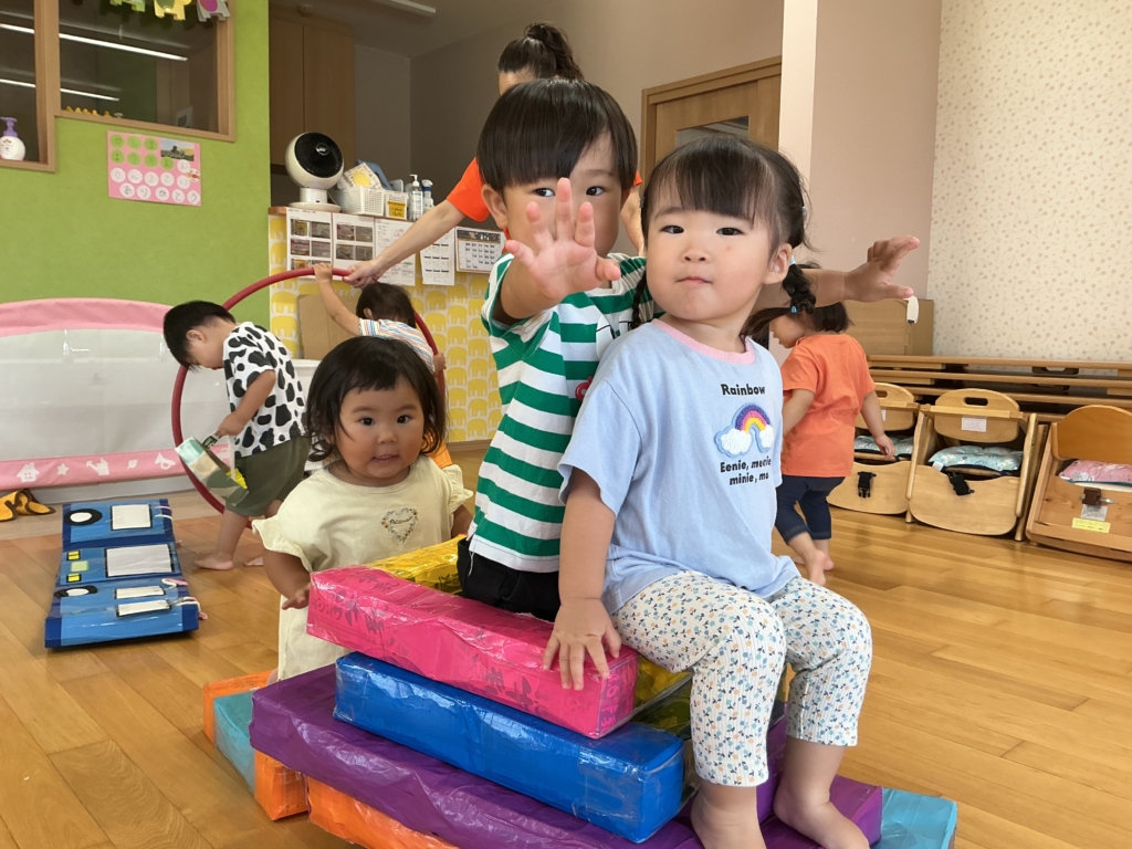 ブロックや輪っかなどを自分たちで積み重ね、バスごっこや電車ごっこを楽しんでいました!