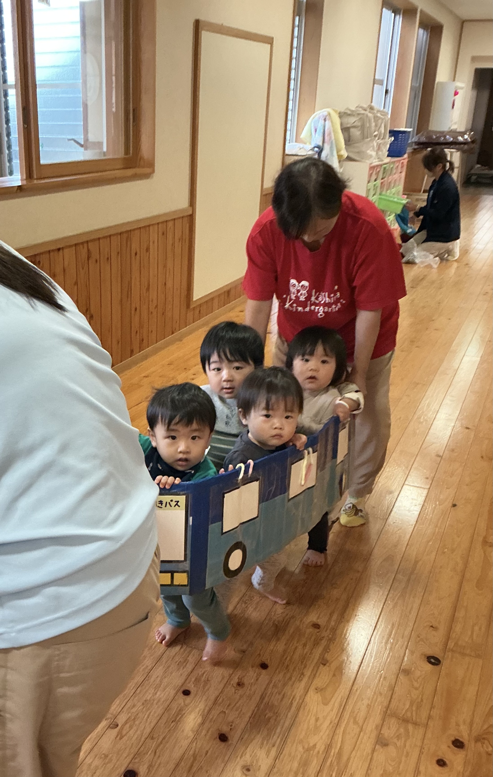 みんなでひよこぐみバスに乗って出発進行です🚌💨途中色々な場所へ寄り道してしまうので中々目的地にはつきませんが、園内をお散歩していると、他のクラスのお兄さんお姉さん達や職員に声を掛けてもらいとっても嬉しそうな子どもたちです💗