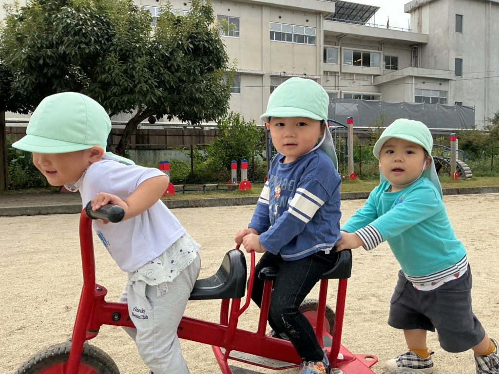 天気のいい日はお友達と三輪車に乗って園庭を駆け回るりす組さん!