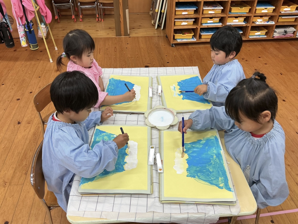 子ども達は白の画用紙にクレヨンを使っているときに、はじめは「みえないよ〜」と言っていたのですが、色を付け加えたことで模様が出てきて「すごいね!」とお友達と話す姿が見られましたよ✨