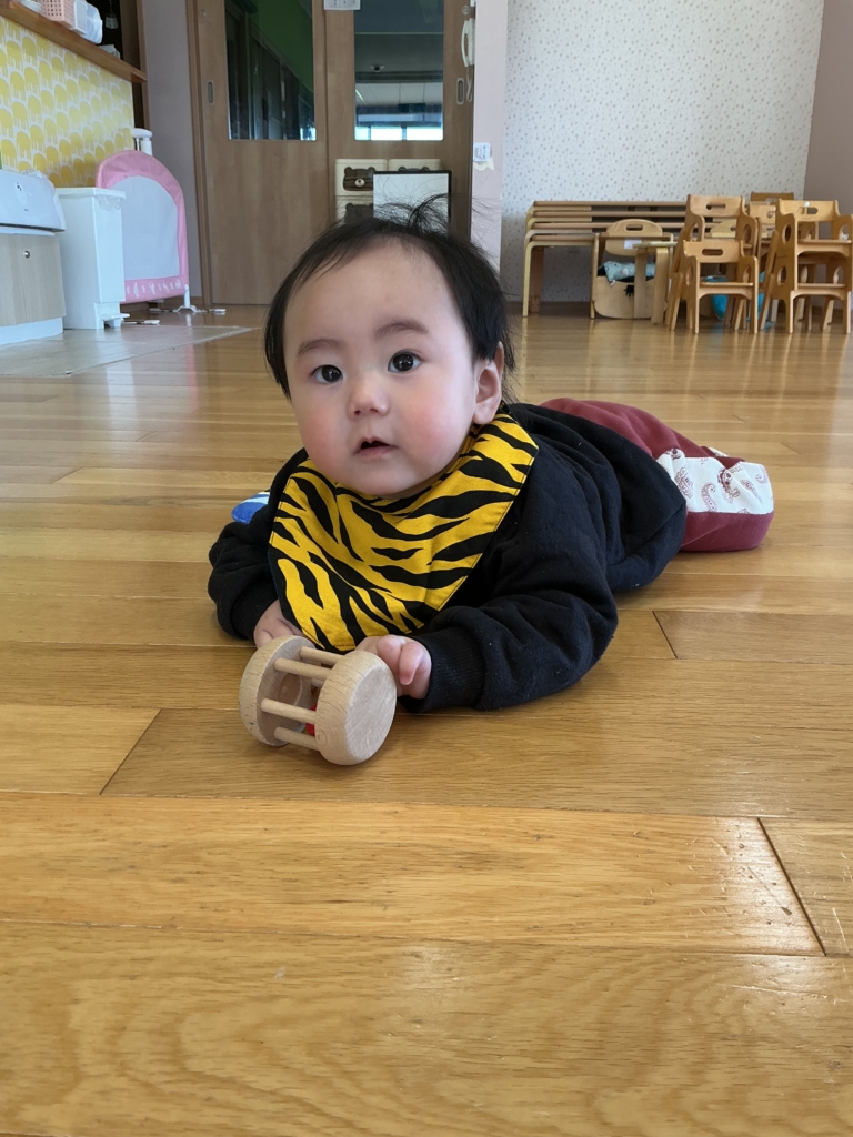 保育室の広い室内も、ずり這いで動いています。