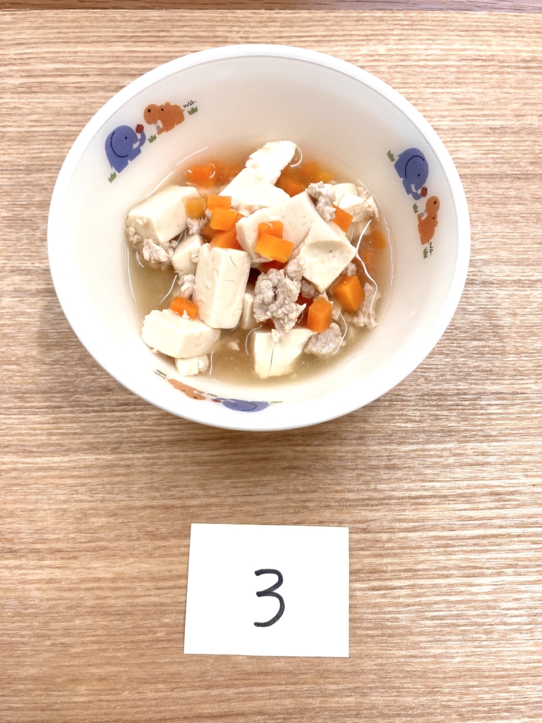 2022/03/30 今日の給食 3月30日の給食です。 今日の献立です。 ・雑穀ご飯 ・蒸し鶏のソースかけ ・みそ汁 ☆蒸し鶏をした際にでた、鶏のエキスをスープにしてみました。 鶏肉に酒や塩、もしくは塩麴でもんだ後、容器に入れて蒸すと 容器に蒸される過程で鶏の旨味を十分に含んだエキスが出てきます。 そのエキスを鍋に移し、少し水を足してあげるとおいしいスープになります。 今回は、レタス・卵を入れてみました。 ご家庭で作るときに、ぜひ活用してみてください。 今日のおやつは「スコーンと牛乳」でした。 2022/03/29 今日の給食 3月29日の給食です 今日の献立は ・ご飯 ・揚げだし豆腐のてりマヨ焼き ・切干大根の煮物 ・お味噌汁 でした! 今日のメインの「揚げだし豆腐」は、味付けをいつもの和風だしではなく みんなが大好きな、てりマヨ味にしてみました^^ 苦手な子も多い豆腐メニューでしたが完食でした♪ おやつは「フルーツヨーグルト」でした^^ 2022/03/29 今日の給食 3月28日の給食です。 今日の献立です。 ・ご飯 ・魚の味噌マヨ焼き ・キャベツの甘酢和え ・白菜とわかめのお味噌汁 おやつは「きな粉蒸しパン・牛乳」でした 2022/03/25 今日の給食 3月25日の給食です。 今日の献立です。 ・黒糖ロール&りんごジャム ・ポークビーンズ ・甘夏のサラダ ・牛乳 今日のおやつは「きなこ棒」でした。 手作り中の「きな粉棒」です。 2022/03/24 今日の給食 3月24日の給食です。 今日の献立です。 ・ご飯 ・豆腐チャンプル ・みそ汁 ・昆布の佃煮 今日のおやつは「蒸かし芋」でした。 ☆いろんな種類の給食☆ 今日の「豆腐チャンプル」ですが、園児に合わせて3種類の「豆腐チャンプル」を作っていました。 ①以上児さんが食べる「豆腐チャンプル」 ②卵アレルギーさん用の「豆腐チャンプル」。 ③未満児「ひよこ組」さん用の「豆腐の煮物。 この「ひよこ組」さん用の「豆腐の煮物」は、成長により大きさを変えています。 おやつも同様に、いろいろなサイズがあります。